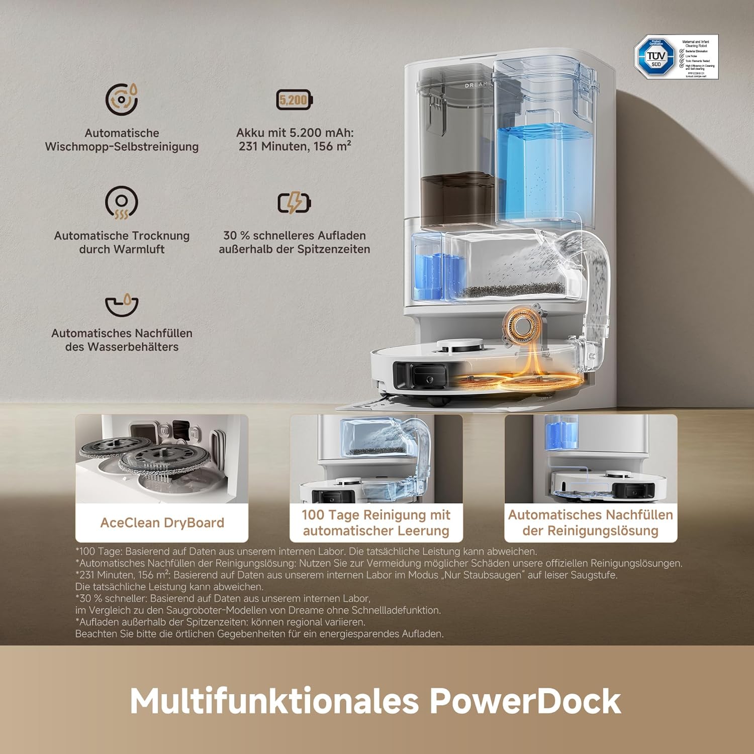 • Sparen Sie Geld durch Aufladen zu günstigeren Tarifen: Genießen Sie bis zu 231 Minuten Laufzeit und 156 m² Reinigung im Leise-Modus, unterstützt durch einen leistungsstarken 5200-mAh-Akku mit 30 % schnellerer Ladung zu Zeiten mit niedrigeren Stromtarifen – für geringeren Energieverbrauch und niedrigere Rechnungen.