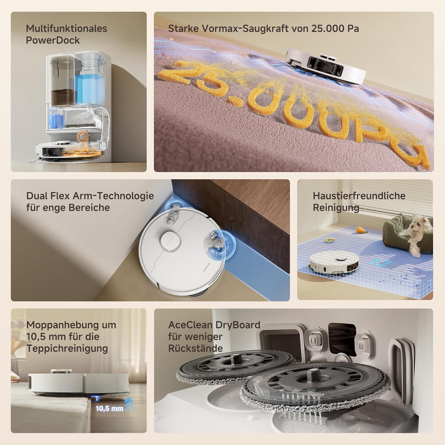 • 25.000 Pa starke Saugleistung: Reinigen Sie mühelos Hartböden, Teppiche und Läufer mit der starken 25.000 Pa Saugkraft und wählen Sie flexibel aus 5 Saugstufen, die auf die Bedürfnisse Ihres Zuhauses abgestimmt sind.
