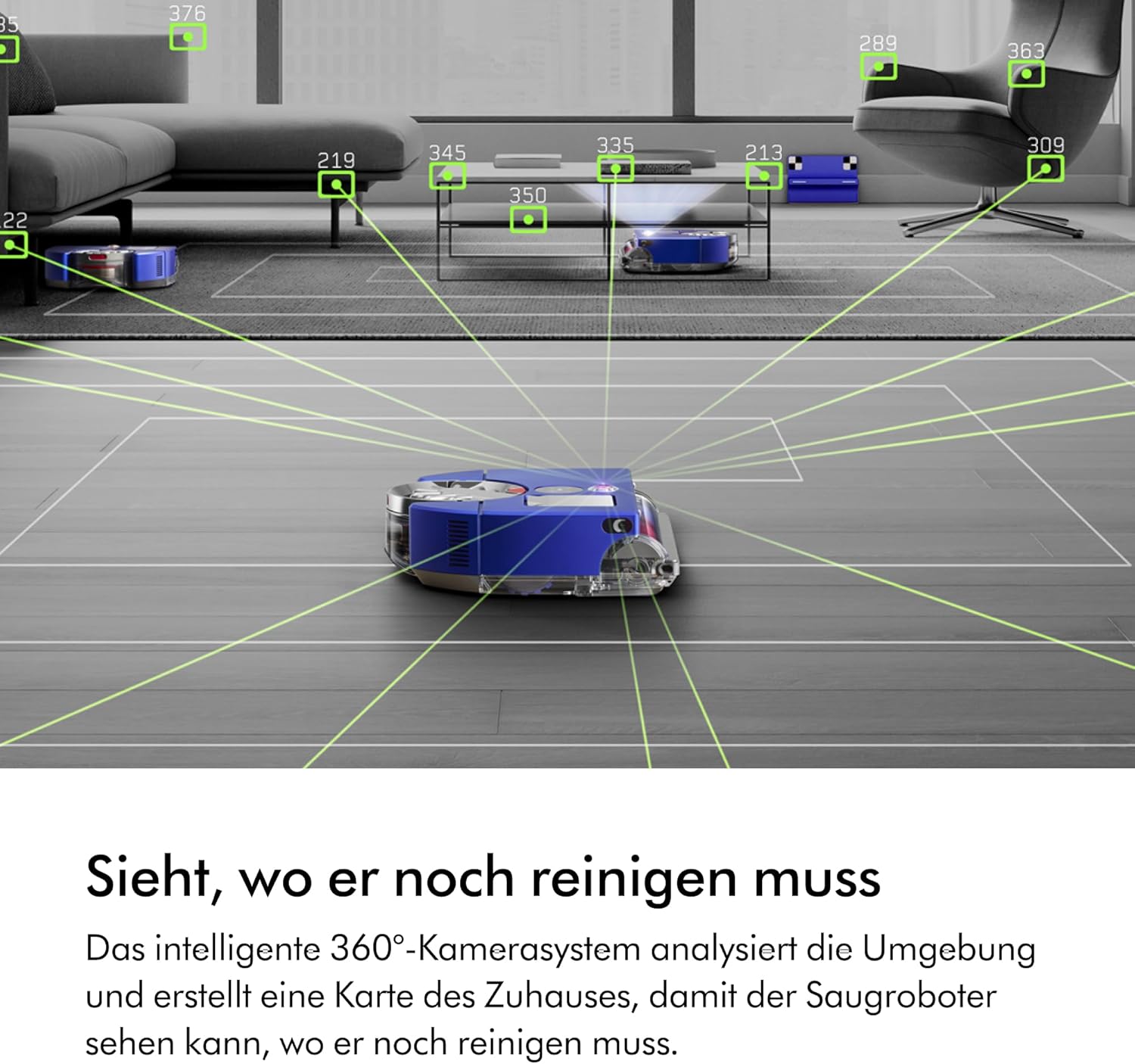 • Im Gegensatz zu seitlichen Kehrrobotern, die den Schmutz wegschleudern, saugt Dyson Schmutz bis an die Wandkante auf. Ein automatisch ausfahrbarer Seitenkanal lenkt die Saugkraft um, die stark genug ist, um auch Schmutz zu entfernen, der sich direkt vor der Wand befindet.