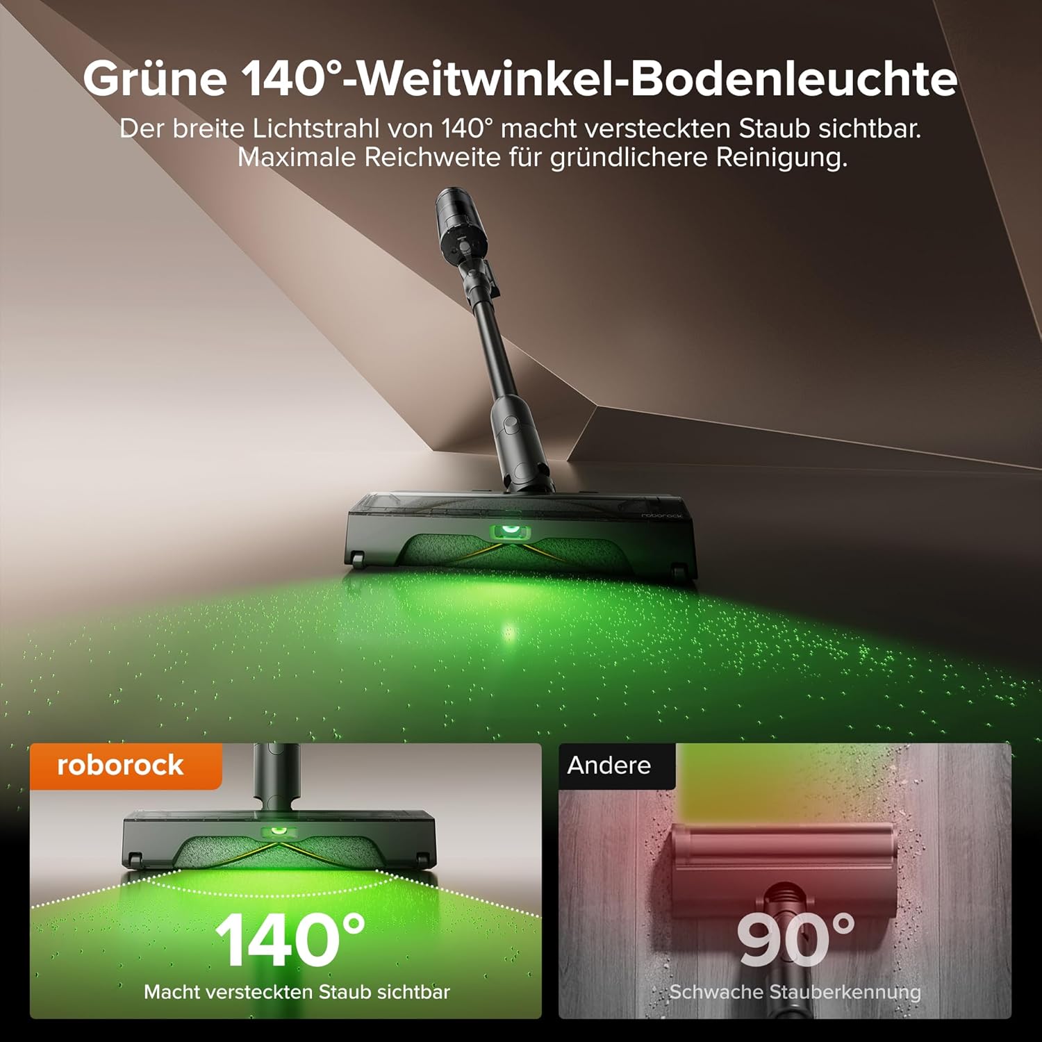 • 140° Weitwinkel-Grünlicht: Das grüne LED-Licht macht feinen Staub sichtbar, den man mit bloßem Auge nicht erkennt. Die breite Ausleuchtung erleichtert das Reinigen entlang von Kanten und unter Möbeln.